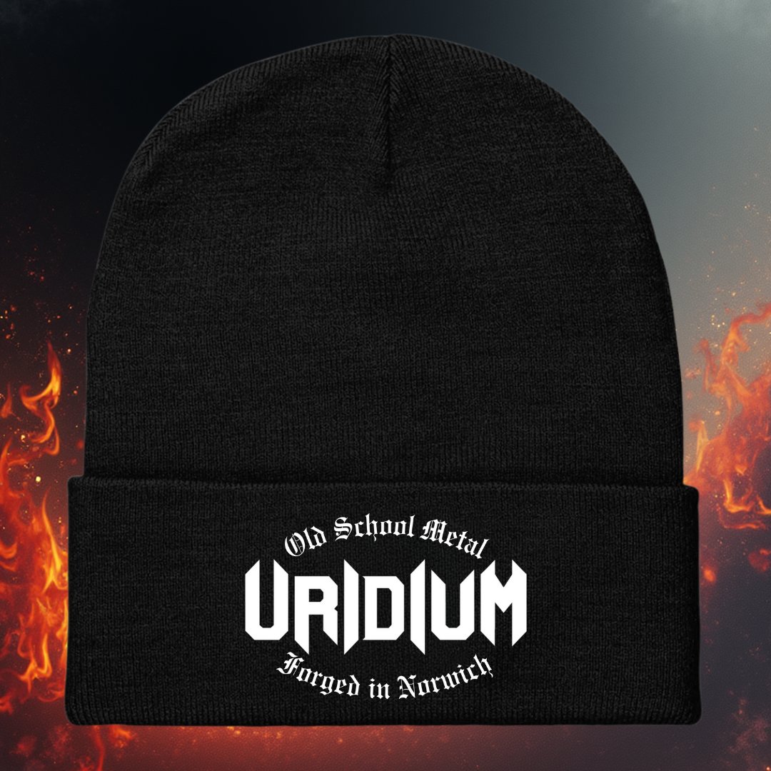 Black Beanie with the Uridium 'Old School Metal Forged in Norwich' logo embroidered on the front.